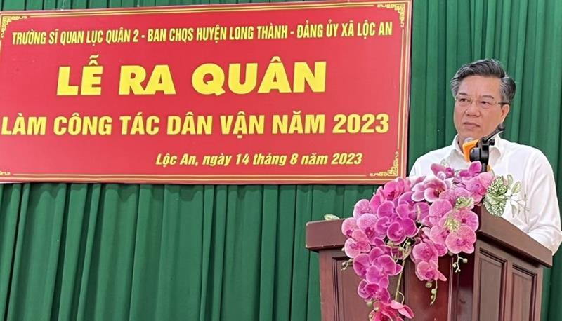 Phát biểu trong lễ ra quân, đồng chí Dương Minh Dũng, Ủy viên Ban TVTU, Bí thư Huyện ủy Long Thành ghi nhận và cảm ơn đóng góp của các đơn vị phối hợp, trực tiếp là Trường Sĩ quan Lục quân 2, Ban Chỉ huy quân sự huyện và các mạnh thường quân hỗ trợ thực hiện đợt dân vận chung sức xây dựng nông thôn mới nâng cao tại Lộc An.