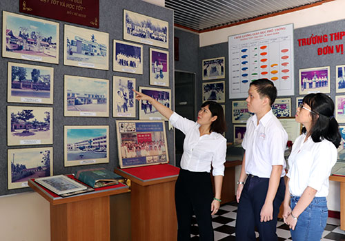 Cô và trò Trường THPT Tân Phú cùng xem lại hình ảnh tư liệu của nhà trường tại phòng truyền thống.