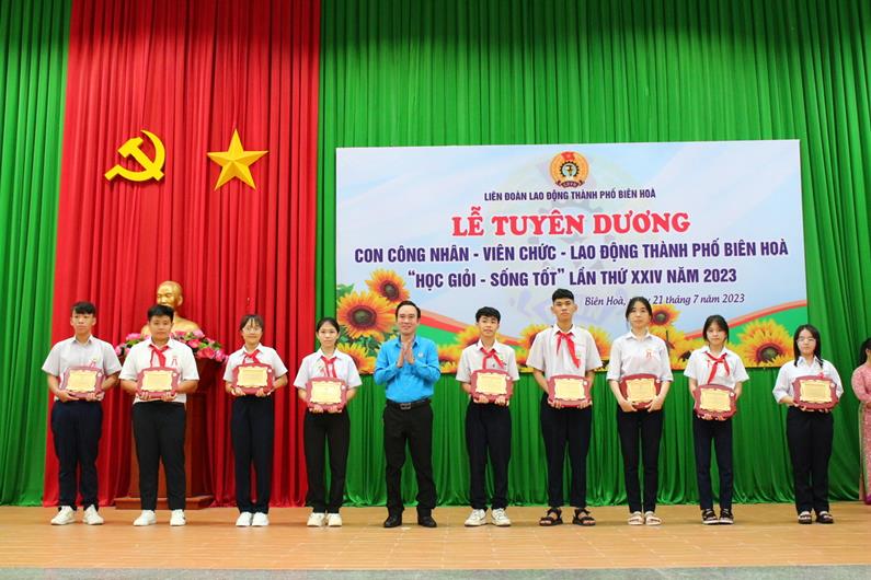 (CTT-Đồng Nai) - Liên đoàn Lao động (LĐLĐ) TP.Biên Hòa vừa tổ chức lễ tuyên dương gần 540 em học sinh con Công nhân viên chức lao động Học giỏi, sống tốt năm học 2022-2023. Đây là những học sinh đạt thành tích xuất sắc trong học tập và rèn luyện, nhiều em đạt các giải cao trong các kỳ thi học sinh giỏi cấp thành phố và tỉnh.