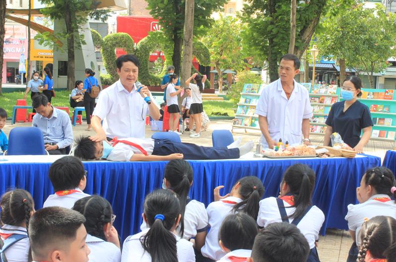 Các em thiếu nhi được hướng dẫn sơ cấp cấp, băng bó vết thương sau lễ khai mạc