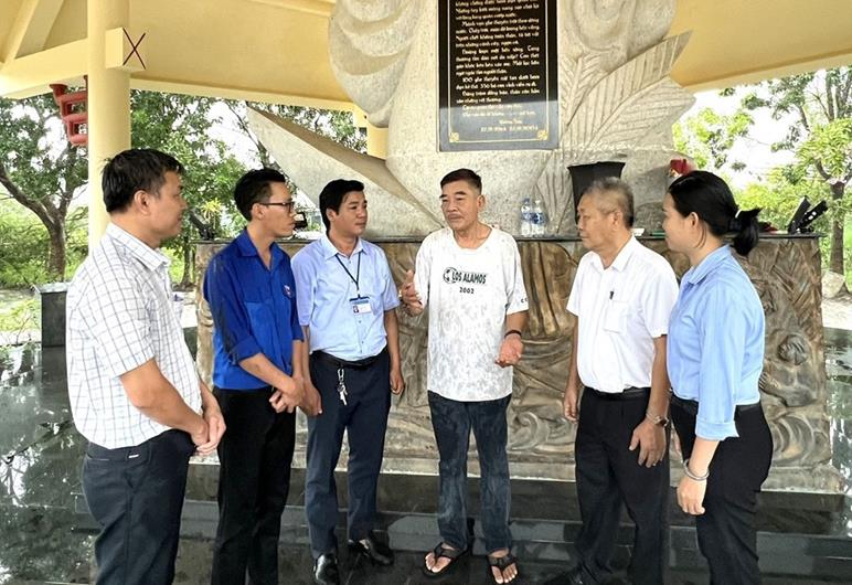 Ông Phạm Đình Khương (thứ ba từ phải qua) giới thiệu về bia tưởng niệm tại Di tích Quốc gia Vụ thảm sát Giồng Sắn.