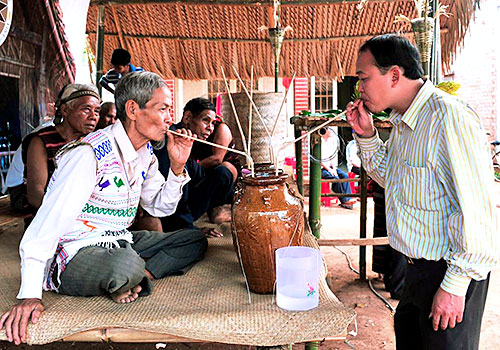 Du khách cùng đồng bào Chơ Ro thưởng thức ẩm thực, văn hóa dân tộc tại Vườn sinh thái Suối Đá.