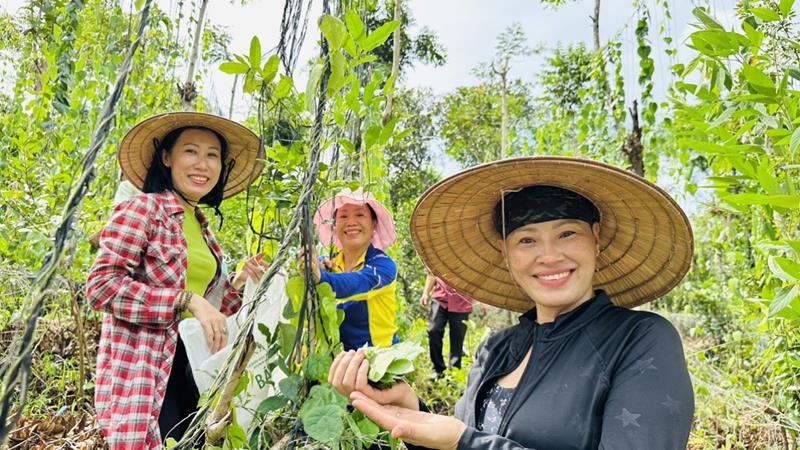 Du khách vui vẻ, hào hứng tham gia thu hoạch lá sương sâm hữu cơ của Yến Lộc Rừng
