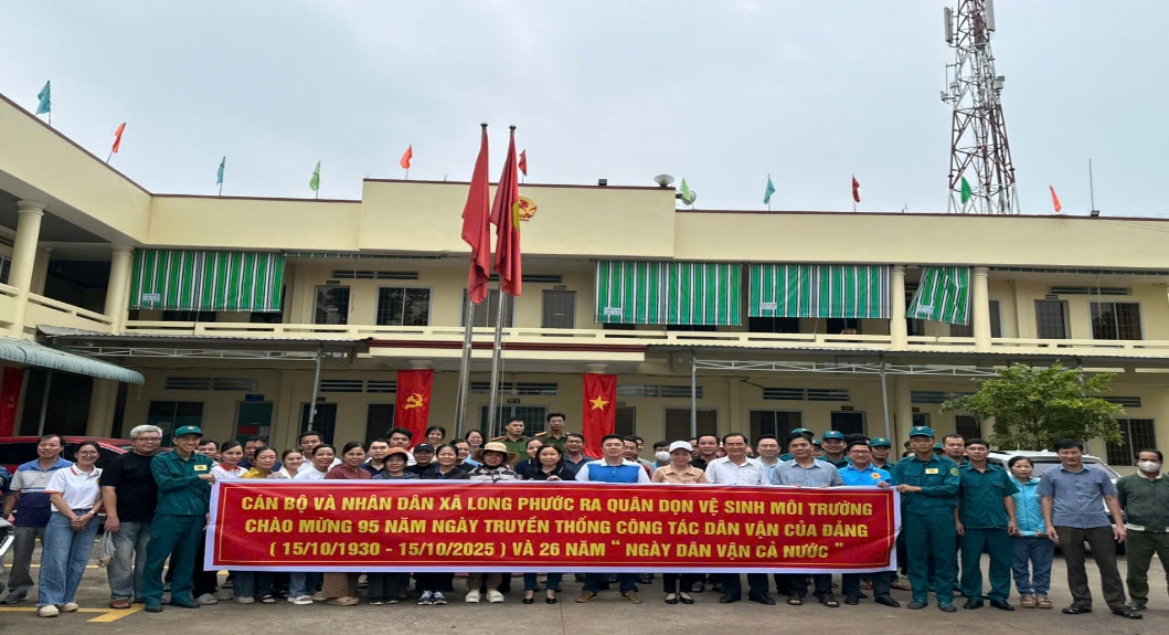 Tập thể cán bộ xã Long Phước ra quân dọn vệ sinh môi trường chào mừng 95 năm Ngày truyền thống Công tác Dân vận của Đảng (15/10/1930 – 15/10/2025) và 26 năm Ngày Dân vận cả nước tại trụ sở Đảng ủy- HĐND-UBND-UBMTTQVN xã Long Phước.