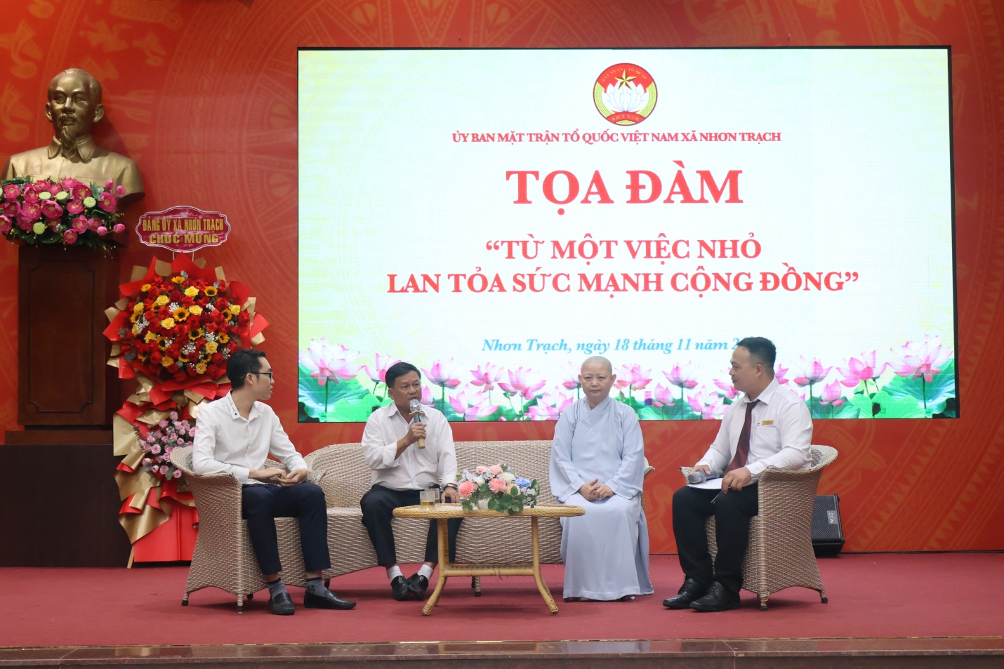 Trong buổi họp mặt, các đại biểu đã tham dự tọa đàm với chủ đề “Từ một việc nhỏ – Lan tỏa sức mạnh cộng đồng”, lắng nghe Ni sư Thích Nữ Huệ Hiếu – Trụ trì chùa Long Hoa; ông Phạm Văn Xước - Trưởng Ban Công tác Mặt trận ấp Phước Lai và đại diện Công ty TNHH Thương mại Hải Minh, đây là những tấm gương tiêu biểu luôn đồng hành cùng Uỷ ban MTTQ Việt Nam xã Nhơn Trạch trong công tác từ thiện, an sinh xã hội và có những cách làm sáng tạo trong công tác vận động nhân dân tham gia các phong trào thi đua yêu nước tại địa phương.