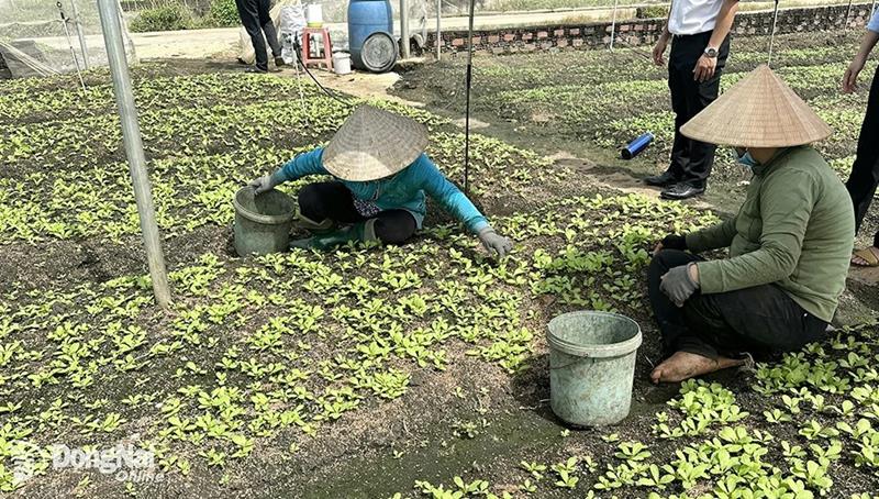Bà Vũ Thị Lý đang tỉa rau, chăm sóc rau cho vụ mới.