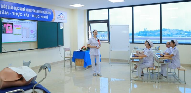 Cô Trần Thị Mỹ Lệ, giảng viên ngành Nữ hộ sinh, Trường Cao đẳng Y tế Đồng Nai trong phần thi tại Hội giảng Nhà giáo GDNN toàn quốc. (Ảnh: ĐVCC)