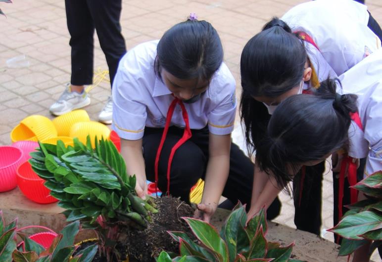 Đội viên, thiếu nhi tham gia trồng cây xanh trong khuôn viên trường