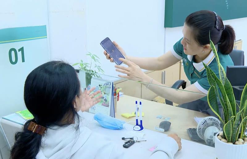 Nhân viên một chi nhánh ngân hàng ở thành phố Biên Hòa hỗ trợ khách hàng thực hiện xác thực sinh trắc học cho tài khoản ngân hàng