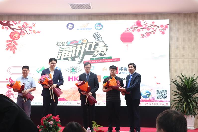 Đại diện Trường Đại học Lạc Hồng tặng hoa cho các thành viên Ban giám khảo Cuộc thi Hùng biện tiếng Trung