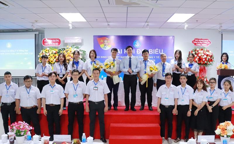 Các đại biểu tặng hoa chúc mừng các ủy viên vừa được bầu vào Ban Chấp hành Hội Sinh viên Trường Cao đẳng Y tế Đồng Nai khóa IV