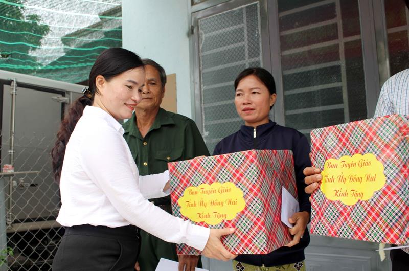Đồng chí Nguyễn Thị Hồng Trang, Phó Trưởng ban Thường trực Ban Tuyên giáo Tỉnh ủy trao quà cho các hộ gia đình tại buổi lễ