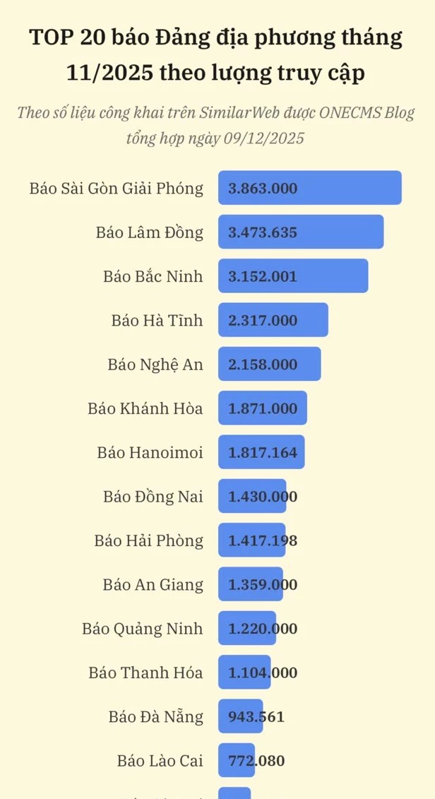 Trong bảng xếp hạng này, Báo Đồng Nai điện tử đứng thứ 8 với 1.430.000 lượt truy cập, thuộc Top 10 báo Đảng địa phương có lượng truy cập cao nhất cả nước. Đây là kết quả cho thấy sự nỗ lực của tập thể Báo và Phát thanh, Truyền hình Đồng Nai trong việc cung cấp thông tin kịp thời, chính xác, đa dạng và phù hợp với nhu cầu của độc giả trong bối cảnh truyền thông số cạnh tranh mạnh mẽ.