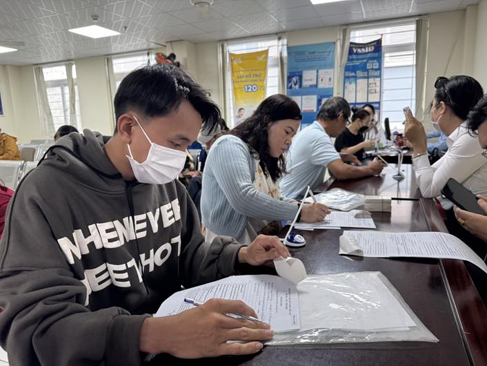 Người dân ghi hồ sơ để giải quyết các thủ tục hành chính liên quan đến chế độ bảo hiểm tại BHXH khu vực V