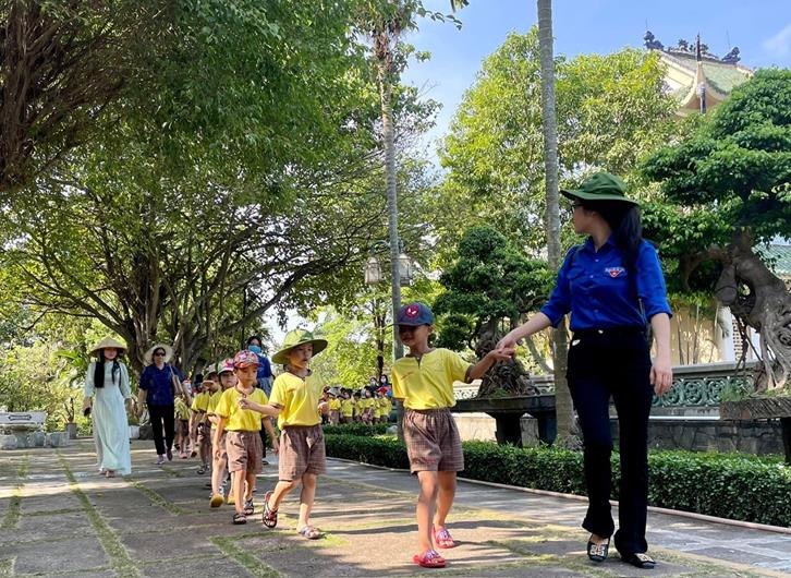 Các em học sinh đến tham quan di tích Văn miếu Trấn Biên trong tháng 10-2024