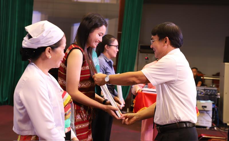 Trưởng Ban Dân tộc tỉnh Nguyễn Văn Khang trao giải văn nghệ cho các đơn vị tham gia