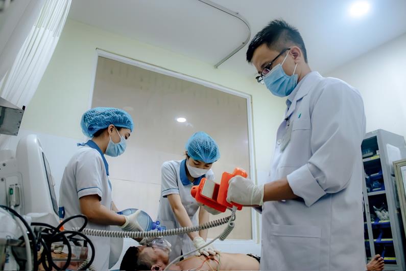 Sau khi tiếp nhận và khai thác nhanh bệnh sử của người bệnh, bác sĩ trực cấp cứu lập tức sốc điện 2 lần kết hợp cấp cứu ngưng hô hấp tuần hoàn nâng cao cho bệnh nhân. Sau 5 phút căng thẳng giành giật sự sống, người bệnh có lại nhịp tim, bắt đầu có những nhịp tự thở, phản xạ đồng tử có phản ứng. Lúc này, huyết áp của bệnh nhân tụt nên phải dùng thuốc vận mạch.