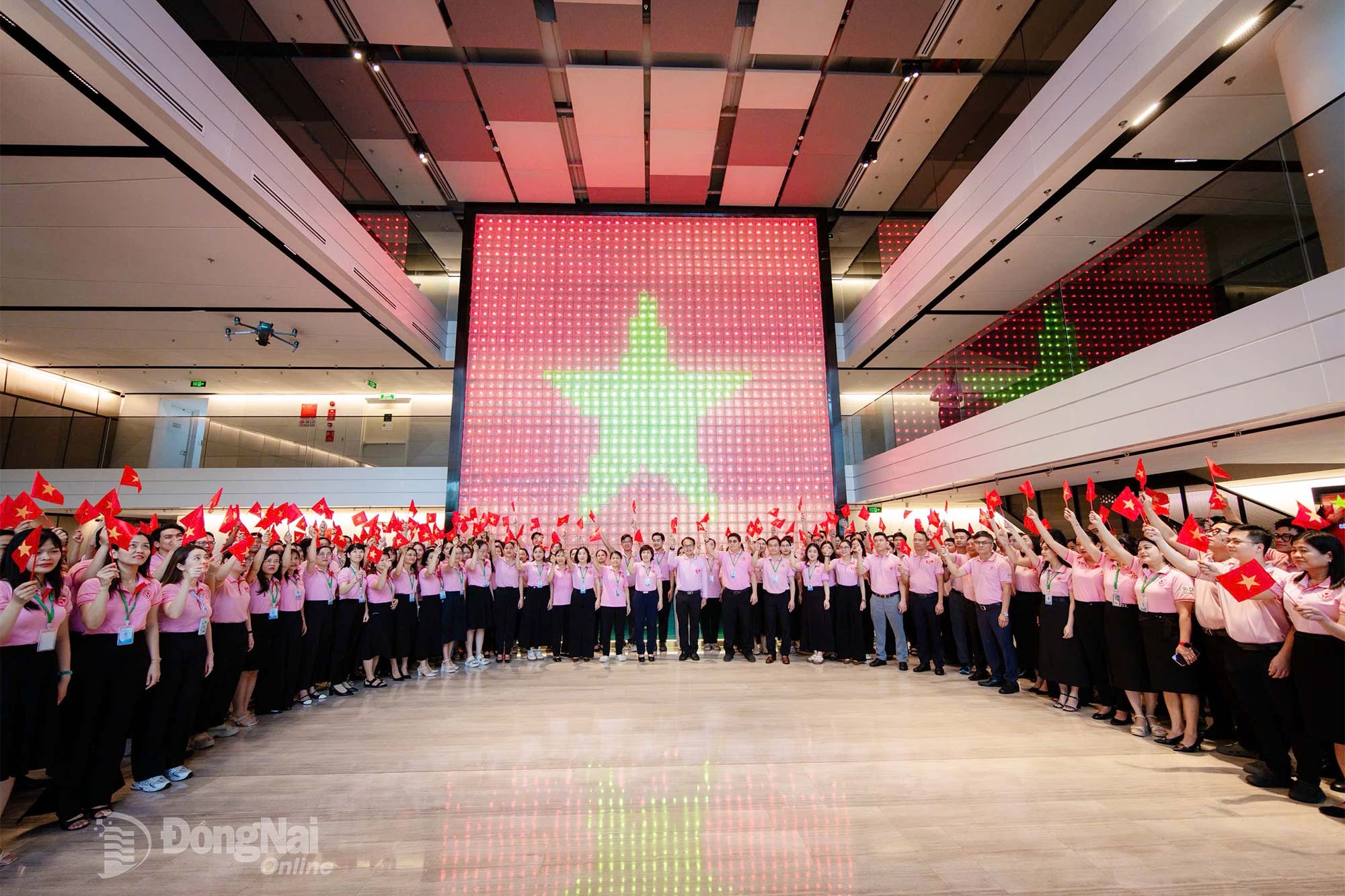 Toàn thể nhân viên Công ty cổ phần Chăn nuôi C.P. Việt Nam đồng loạt vẫy cờ Tổ quốc, tạo nên hình ảnh rực rỡ tại trụ sở chính. Ảnh: Huy Anh