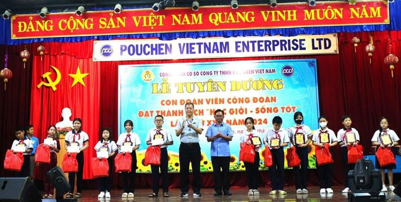 Các em học sinh con công nhân Công ty TNHH Pouchen được Công đoàn tuyên dương, khen thưởng. Ảnh: N.Hòa