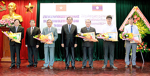 Bí thư Tỉnh ủy Nguyễn Phú Cường, Chủ tịch UBND tỉnh Đinh Quốc Thái, Phó Chủ tịch UBND tỉnh Trần Văn Vĩnh nhận Huân chương Tự do của nước CHDCND Lào.