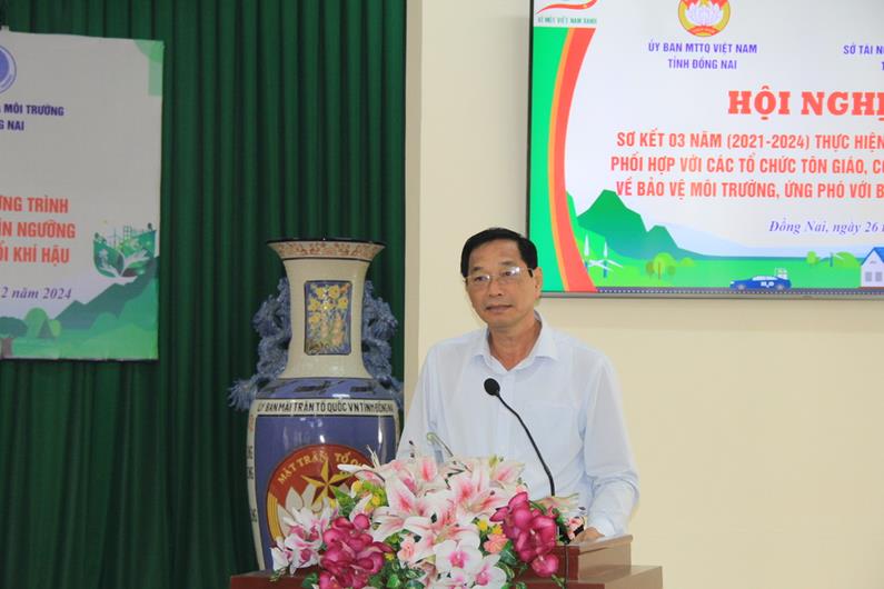 (CTT-Đồng Nai) - Sáng 26-12, Phó Chủ tịch UBND tỉnh Võ Văn Phi đã dự hội nghị sơ kết 3 năm (2021-2024) triển khai thực hiện chương trình phối hợp phát huy vai trò của các tổ chức tôn giáo, cơ sở tín ngưỡng tham gia bảo vệ môi trường (BVMT) và ứng phó với biến đổi khí hậu trên địa bàn tỉnh Đồng Nai giai đoạn 2021-2026. Hội nghị do Ủy ban MTTQ tỉnh và Sở Tài nguyên và môi trường phối hợp tổ chức.