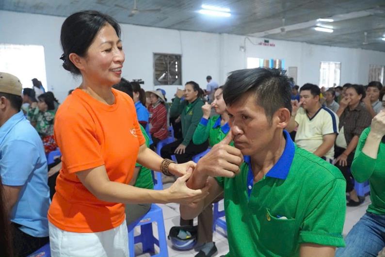 Đồng hành với công nhân, Liên đoàn Lao động tỉnh vừa phối hợp với Trung tâm Tư vấn sức khỏe phục hồi tự nhiên - Mermaid Yoga hướng dẫn tập yoga cho 200 NLĐ tại các DN. Theo đó, huấn luyện viên yoga đã hướng dẫn NLĐ thực hiện các động tác yoga, giúp NLĐ thư giãn như: kiểm soát nhịp thở, vận động chân, tay, các cơ, lưng…, nhất là các bài tập phù hợp với tư thế ngồi và đứng làm việc trong thời gian dài. Nhiều công nhân phấn khởi khi học thêm nhiều bài tập tốt cho sức khỏe và quan trọng nhất là nâng cao ý thức yêu thương, chăm sóc bản thân.
