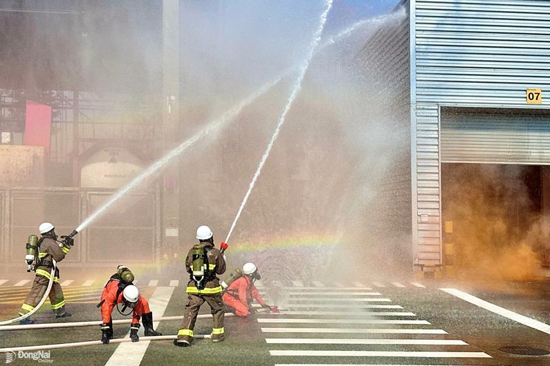 UBND tỉnh tổ chức diễn tập ứng phó sự cố hóa chất theo phương án cấp tỉnh phối hợp nhiều lực lượng tại Công ty TNHH Bosch Việt Nam (Khu công nghiệp Long Thành, xã An Phước) tháng 10-2024. Ảnh: Đăng Tùng