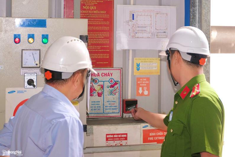 Phòng Cảnh sát phòng cháy, chữa cháy và cứu nạn, cứu hộ Công an tỉnh kiểm tra an toàn phòng cháy tại Công ty TNHH TK P&S Vina (Khu công nghiệp Lộc An - Bình Sơn, xã Long Thành). Ảnh: Đăng Tùng