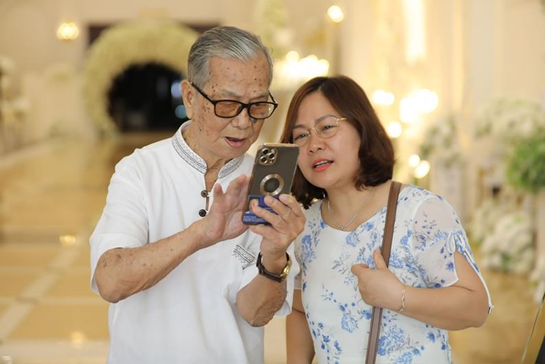 Nhà báo Vân Anh, Đài Phát thanh - Truyền hình Đồng Nai (bìa phải) đọc báo cùng nhạc sĩ Trần Viết Bính trên điện thoại di động