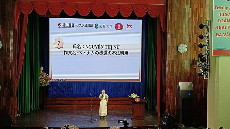 Sinh viên Nguyễn Thị Nữ tại buổi thi chung kết cuộc thi Hùng biện tiếng Nhật lần thứ 7, năm 2024