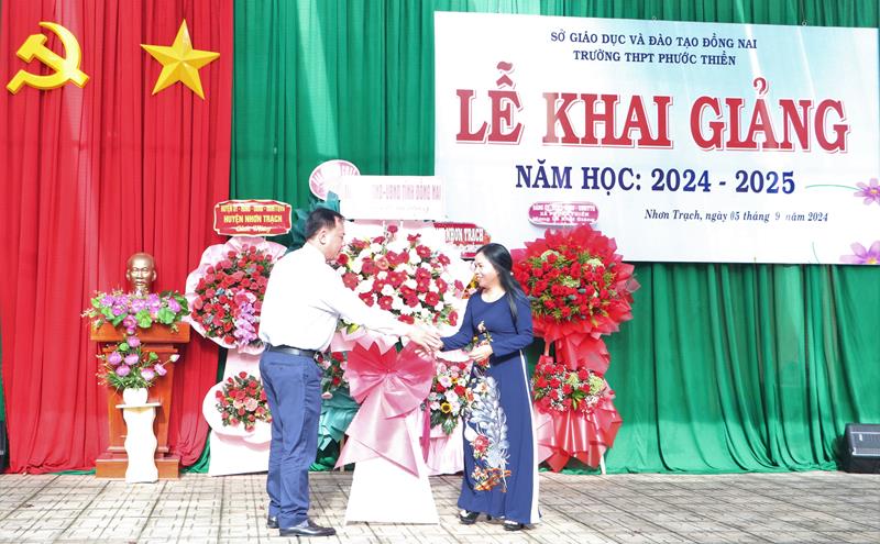 Chủ tịch UBND tỉnh Võ Tấn Đức trao tặng lẵng hoa chúc mừng năm học mới của Tỉnh ủy - HĐND - UBND tỉnh - Ủy ban MTTQ Việt Nam tỉnh tặng giáo viên và học sinh Trường Trung học phổ thông Phước Thiền.