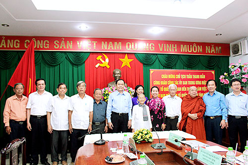 Chủ tịch Ủy ban Trung ương MTTQ Việt Nam Trần Thanh Mẫn chụp hình lưu niệm với lãnh đạo, nguyên lãnh đạo Ủy ban MTTQ Việt Nam tỉnh.