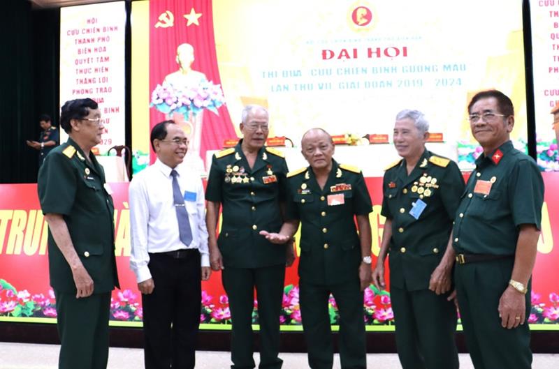 Chủ tịch Hội Cựu chiến binh tỉnh và các đại biểu trao đổi tại Đại hội Thi đua Cựu chiến binh gương mẫu thành phố Biên Hòa