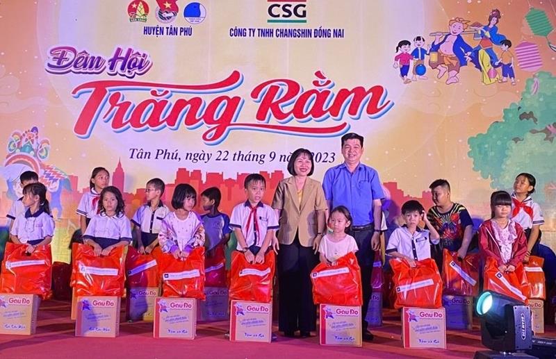 Trong đó, Đảng ủy, Đoàn cơ sở Công ty TNHH Changshin Việt Nam đã phối hợp với UBND huyện và Huyện đoàn Tân Phú trao 400 phần quà cho các em thiếu nhi, trong đó có 100 phần quà dành cho thiếu nhi là con công nhân đang làm việc tại chi nhánh Công ty TNHH Changshin Việt Nam tại H.Tân Phú. Bên cạnh đó, Đảng ủy, Đoàn cơ sở công ty còn phối hợp với UBND xã Thạnh Phú tổ chức trao tặng 450 phần quà (gồm: bánh trung thu, lồng đèn) cho con công nhân lao động tại địa phương và công nhân lao động đang làm việc tại công ty.