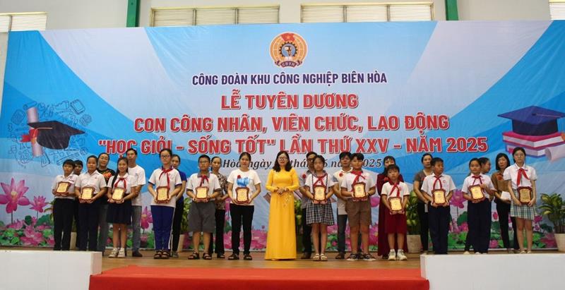 Cụ thể, Công đoàn Khu công nghiệp Biên Hòa tổ chức lễ tuyên dương con công nhân, viên chức lao động Học giỏi, sống tốt lần thứ 25-2025. Theo đó, năm học 2024-2025, có 135 học sinh điển hình có nhiều kết quả nổi bật trong học tập được xét chọn từ các Công đoàn cơ sở được khen thưởng. Trong đó, có 53 cháu là học sinh tiểu học, 39 cháu học sinh trung học cơ sở, 38 cháu là học sinh trung học phổ thông và 5 cháu là sinh viên đại học. Ngoài ra, Công đoàn Khu công nghiệp Biên Hòa đã xét chọn 45 học sinh có thành tích tiêu biểu để tuyên dương cấp tỉnh.