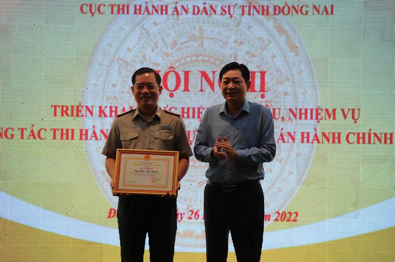 Phó Tổng cục trưởng Tổng cục thi hành án dân sự Nguyễn Văn Sơn tặng giấy khen cho Cục trưởng Cục thi hành án dân sự tỉnh Trịnh Ngọc Quỳnh đã đạt thành tích xuất sắc năm 2022