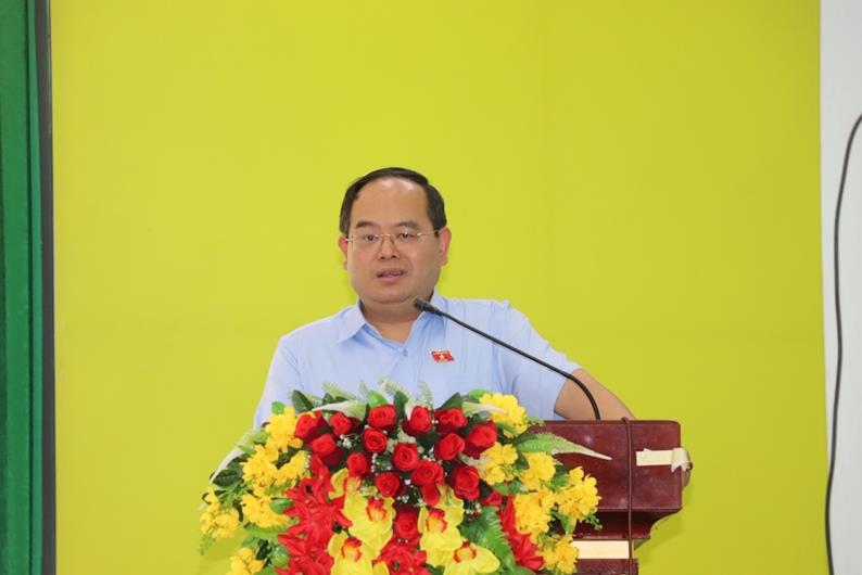 Phó Bí thư Tỉnh ủy, Trưởng Đoàn đại biểu Quốc hội tỉnh Quản Minh Cường phát biểu tại hội nghị tiếp xúc cử tri.