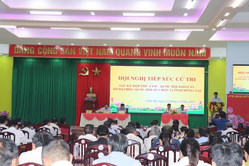 (CTT-Đồng Nai) - Tiếp tục chương trình tiếp xúc cử tri sau Kỳ họp thứ 8, Quốc hội khóa XV, chiều 12-12, tổ đại biểu Quốc hội (ĐBQH) số 3, đơn vị tỉnh Đồng Nai gồm các đại biểu: Quản Minh Cường, Phó Bí thư Tỉnh ủy, Trưởng Đoàn ĐBQH tỉnh; Nguyễn Công Long, Ủy viên thường trực Ủy ban Tư pháp của Quốc hội và Đỗ Huy Khánh, Phó Giám đốc Sở Giáo dục và Đào tạo đã đến tiếp xúc cử tri huyện Cẩm Mỹ.