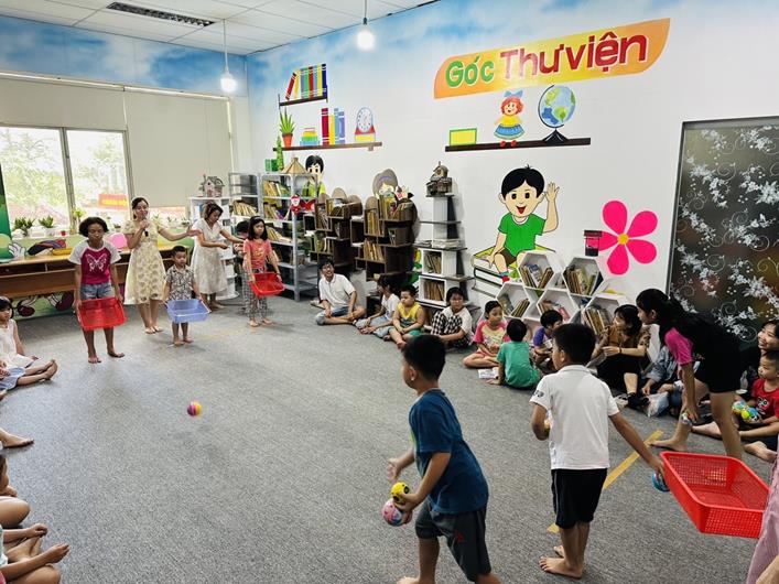 Các em học sinh tham gia trò chơi tại Phòng Đọc thiếu nhi Thư viện Đồng Nai trong tháng 8-2024