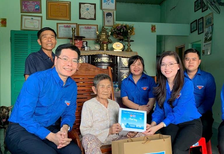 Đại diện Trung ương Đoàn, Tỉnh đoàn và Đoàn xã Thạnh Phú (huyện Vĩnh Cửu) chụp hình lưu niệm với Mẹ Việt Nam anh hùng Hồ Thị Vàng