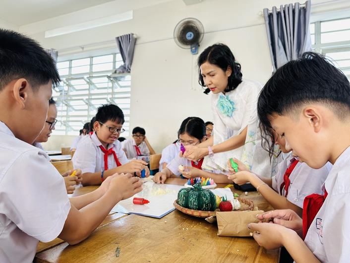 Học sinh Trường THCS Tân Phong thực hành nặn bột giấy để tạo hình sản phẩm