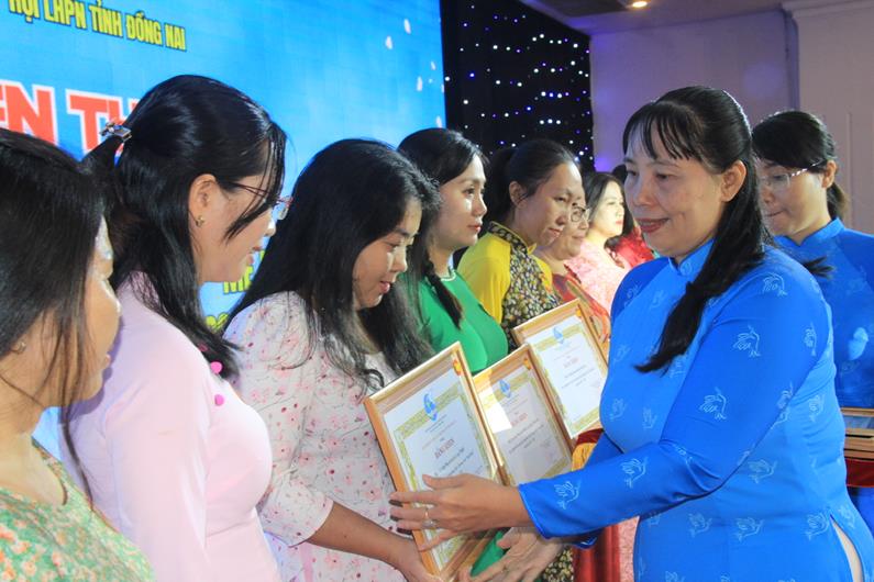 Bà Lê Thị Thái, Chủ tịch Hội LHPN tỉnh trao bằng khen cho các tập thể có thành tích xuất sắc trong thực hiện chương trình Mẹ đỡ đầu