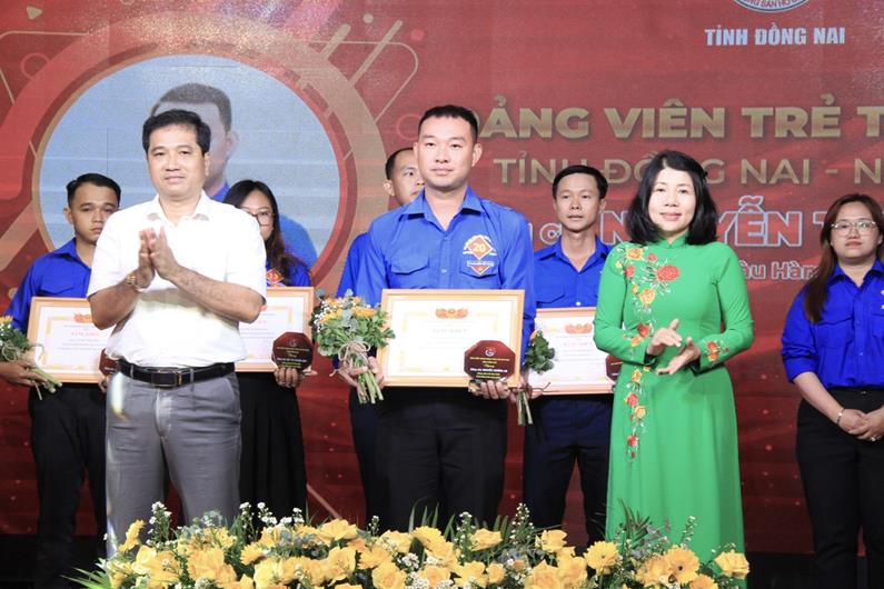 Phó Chủ tịch HĐND tỉnh Hoàng Thị Bích Hằng (bìa phải) và Phó Trưởng ban Tổ chức Tỉnh ủy Nguyễn Thanh Liêm trao bằng khen và biểu trưng cho đảng viên trẻ được tuyên dương