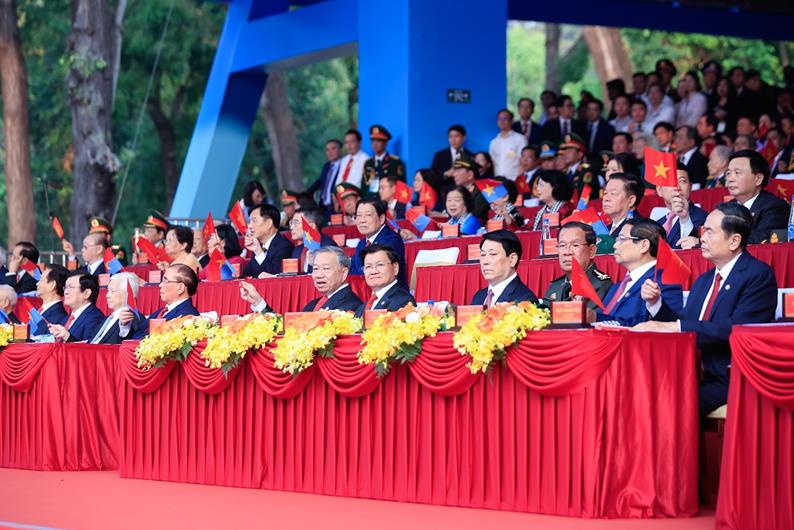 Tổng Bí thư Tô Lâm và các đồng chí Lãnh đạo, nguyên Lãnh đạo Đảng, Nhà nước cùng các vị khách quốc tế và đại biểu dự buổi lễ - Ảnh: VGP/Nhật Bắc