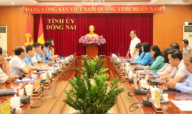 (CTT-Đồng Nai) - Đoàn công tác của Tổng Liên đoàn Lao động (LĐLĐ) Việt Nam do ông Ngọ Duy Hiểu, Phó Chủ tịch Tổng LĐLĐ Việt Nam làm Trưởng đoàn đã có buổi làm việc với Thường trực Tỉnh ủy Đồng Nai về công tác phát triển đoàn viên, thành lập công đoàn cơ sở. Tiếp và làm việc với đoàn có các đồng chí Quản Minh Cường, Phó Bí thư Tỉnh ủy, Trưởng Đoàn đại biểu Quốc hội tỉnh. Cùng dự có Phó Chủ tịch UBND tỉnh Nguyễn Sơn Hùng và đại diện các sở, ngành, địa phương, các đơn vị Công đoàn cấp trên cơ sở.