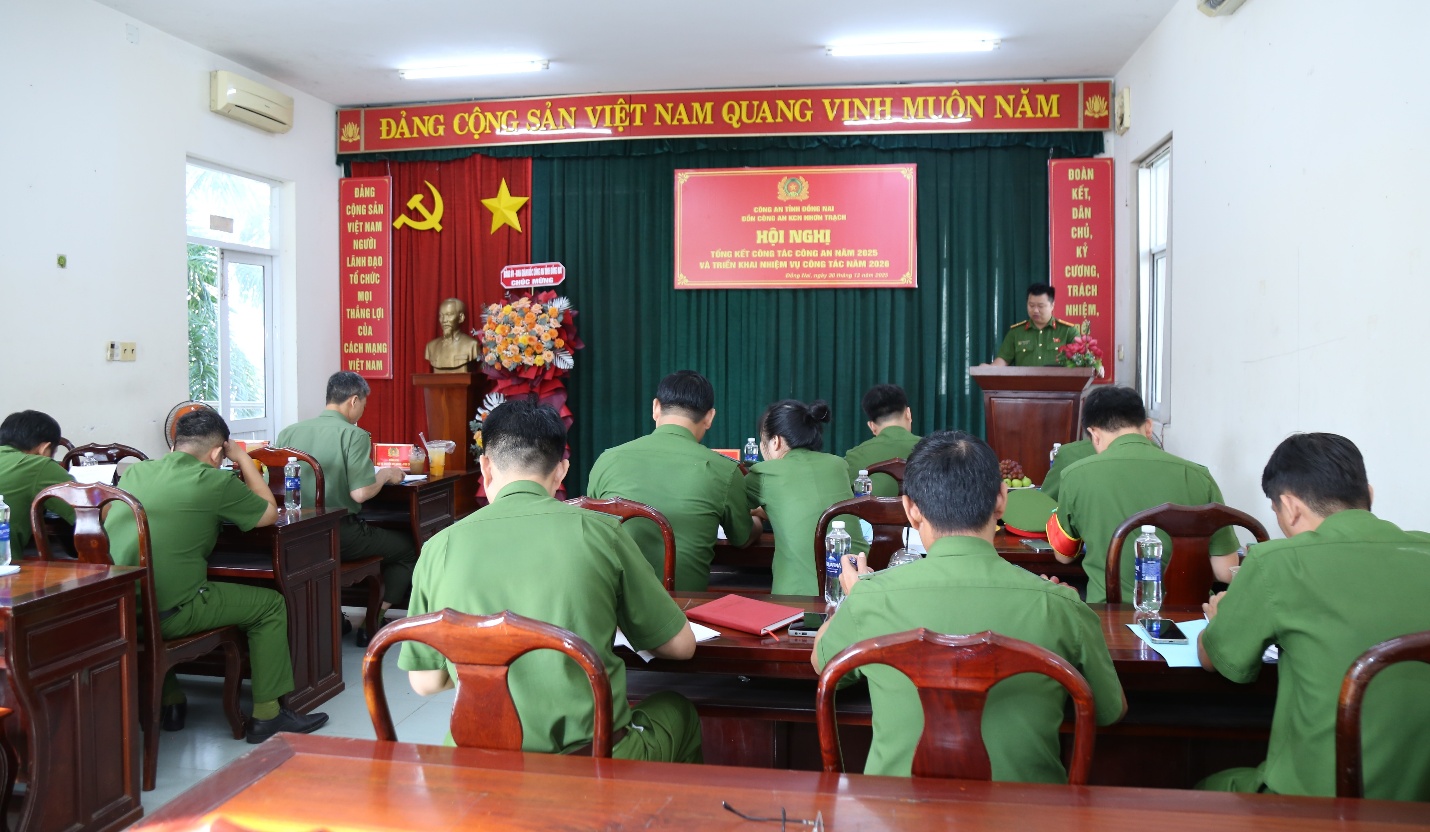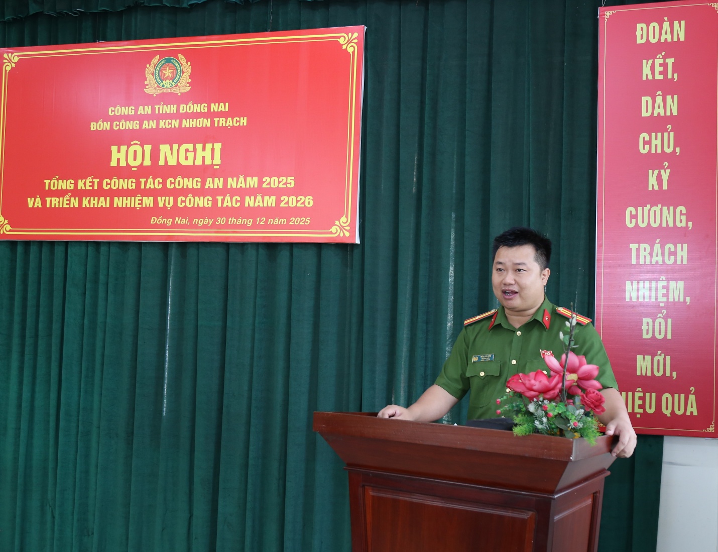 Phát biểu chỉ đạo tại hội nghị, đồng chí Đại tá Nguyễn Anh Hùng, Phó Giám đốc Công an tỉnh Đồng Nai ghi nhận và biểu dương những kết quả, thành tích mà Đồn Công an Khu công nghiệp Nhơn Trạch đã đạt được trong năm 2025. Đồng chí nhấn mạnh, trong thời gian tới, đơn vị cần tiếp tục nâng cao tinh thần trách nhiệm, chủ động nắm chắc tình hình từ sớm, từ xa; lấy công tác phòng ngừa là chính; tăng cường phối hợp với các phòng nghiệp vụ, chính quyền địa phương và doanh nghiệp trong công tác bảo đảm an ninh trật tự.