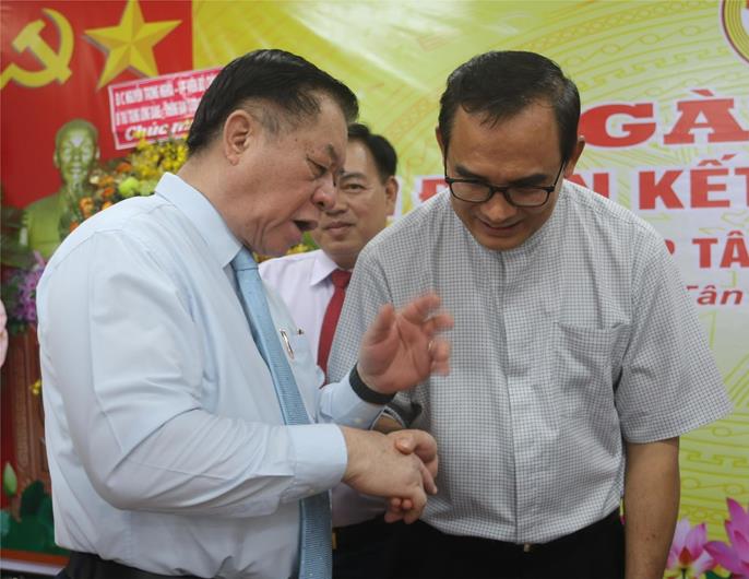 Trưởng Ban Tuyên giáo Trung ương Nguyễn Trọng Nghĩa trao đổi cùng linh mục Trần Mạnh Duyên, Chánh xứ giáo xứ Bùi Đệ khi về dự Ngày hội Đại đoàn kết toàn dân tộc tại ấp Tân Bắc, xã Bình Minh, huyện Trảng Bom