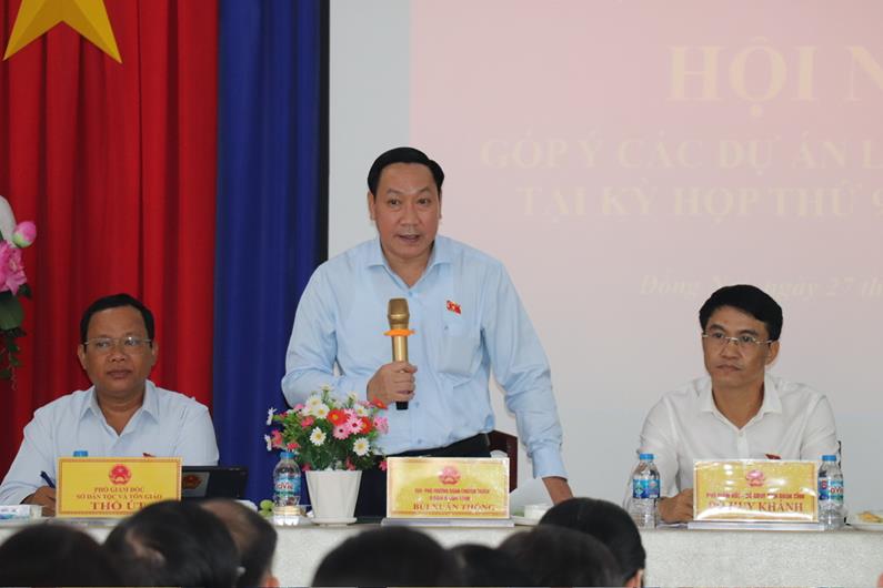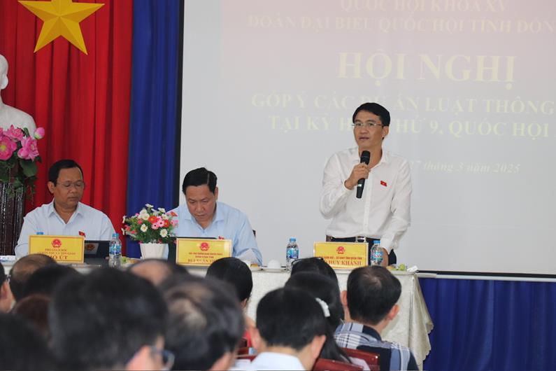 Ông Bùi Xuân Thống, Phó Trưởng đoàn chuyên trách Đoàn đại biểu Quốc hội tỉnh, phát biểu tại hội nghị