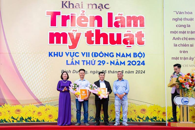 Tác giả Trần Đình Thắng (Đồng Nai, thứ 2 từ trái qua) được trao giải ba Triển lãm Mỹ thuật Đông Nam bộ năm 2024