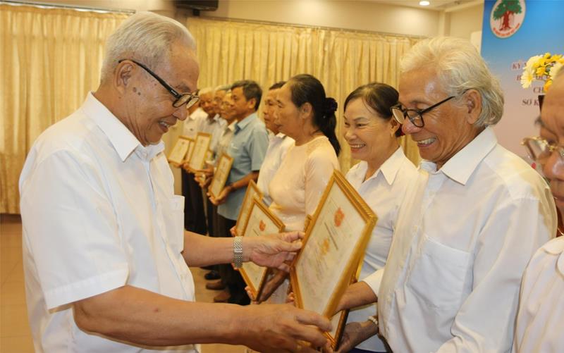 Phó trưởng Ban Đại diện Hội Người cao tuổi tỉnh Nguyễn Công Ngôn khen thưởng người cao tuổi tiêu biểu.